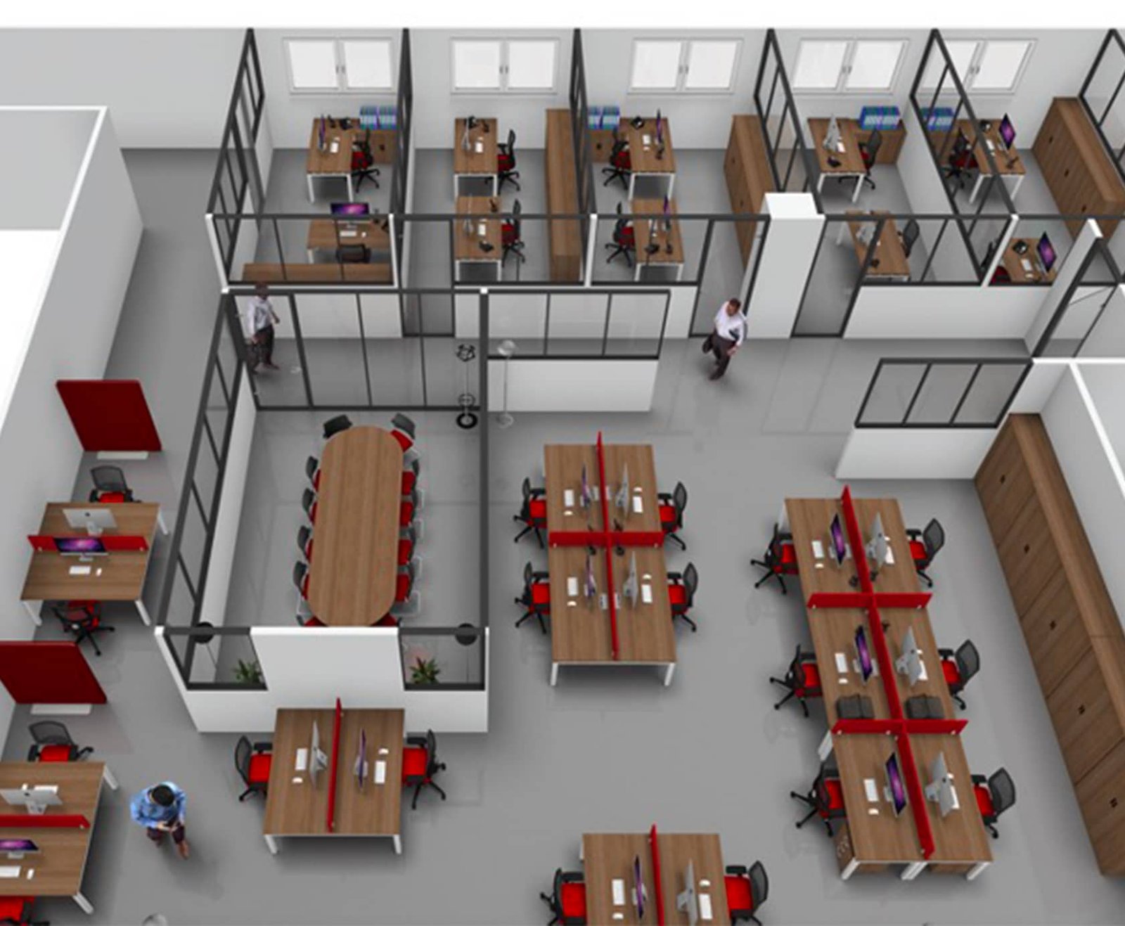 Le mobilier proposé était de gamme intermédiaire avec des bureaux électrifiés incluant le passage des câbles, de l’acoustique sous forme de panneaux et tentures, des tables modulables abattantes sur roulettes et une cellule acoustique de travail pour 6 personnes …