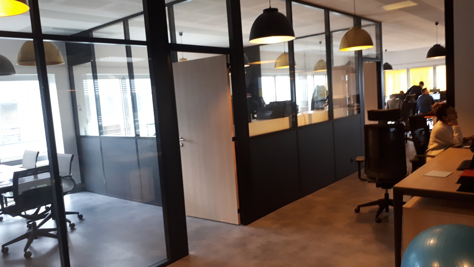 Résultat : un plafond et des cloisons noirs, de beaux vitrages et du mobilier aux coloris et matériaux soignés.